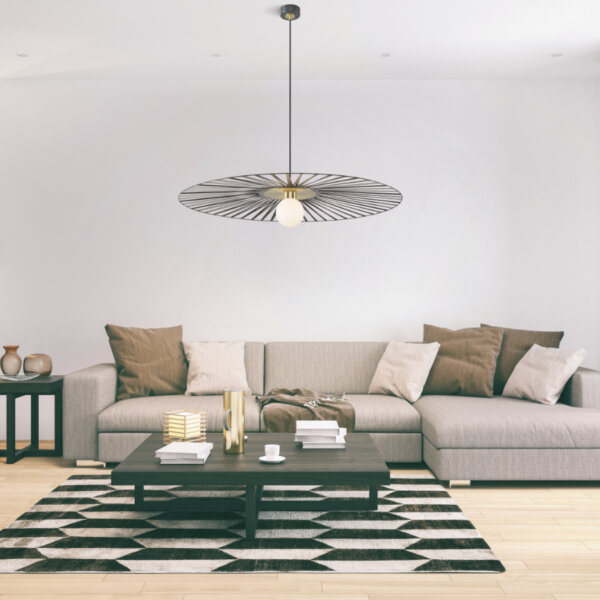 Die Hängeleuchte Oriana der französischen Marke „Un autre regard“ verleiht Ihrer Einrichtung einen raffinierten, graphischen Touch. Die schwarze Metallscheibe ist mit einem Polymerband verkleidet, das sich in der Mitte des Schirms zusammenfügt und mit einem Messing-Finish delikat abgerundet wird. Die verschiedenen Materialien verleihen der Lampe ein zeitgenössisches Design, das klassische Details mit Moderne vereint und für ein schickes und trendiges Ergebnis sorgt.