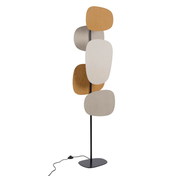 Die Struktur aus mattschwarzem Metall bildet die Basis, worauf die Schirme verschiedener Grössen wie draufgelegt zu sein scheinen, was eine leichte und luftige Optik erzeugt. Die Schirme aus Leinen haben unterschiedliche Farben: Curry, Birke und Jute – Farben, die an die Deko-Trends der 1970er Jahre erinnern. Die Schirme sind lichtdurchlässig, sodass die Wände subtil mit Lichtspielen verziert werden. Glühbirnen nicht inbegriffen.