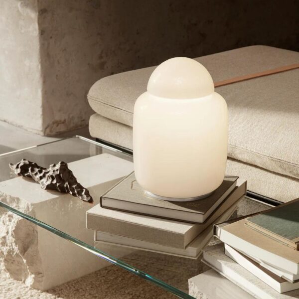 Inspiriert von den Vintage-Glaslampen der 70er Jahre, beleuchtet die Tischleuchte Bell Ihr Zuhause mit einem weichen, gestreuten Licht. Die Leuchte ist vollständig aus Opalglas mit einer glatten, glänzenden Oberfläche gefertigt und besteht aus zwei einfachen geometrischen Formen, die auf einem Chromfuss im Gleichgewicht gehalten werden. Verwenden Sie sie als dekorative Lampe in einer dunklen Ecke oder auf einem Regal, um Ihre Lieblingsbücher zu beleuchten.