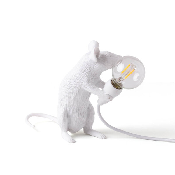 Mit dieser Tischlampe, die einer echten Maus verblüffend ähnlich sieht, greift der Designer Marcantonio Raimondi Malerba erneut auf sein Lieblingsthema zurück: die Verbindung zwischen Mensch und Natur. Diese hübsche, originelle Leuchte gibt es in verschiedenen Positionen (stehende, sitzende oder liegende Maus) und in diversen Farben (weiss und gold). Alle Varianten werden sicherlich ein verschmitztes, stimmungsvolles Licht in Ihre Dekoration bringen. Anstelle eines traditionellen Käses hält das kleine Nagetier eine LED-Glühbirne (inbegriffen) zwischen seinen Pfoten. Dies verleiht der Leuchte einen lustigen und schrägen Touch, der Gross und Klein gefallen wird. Die aus Kunstharz gefertigte Lampe ist sehr realistisch. Die Lampe wird an ein USB-Kabel angeschlossen, sodass Sie sie an verschiedene Geräte oder an jede herkömmliche Steckdose anschliessen können.