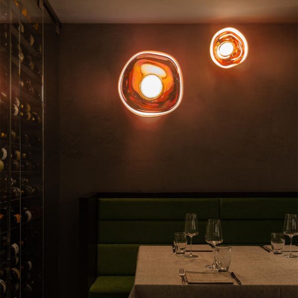 L’applique murale Melt surface est disponible dans les couleurs cuivrées, chromées, dorées et fumées.