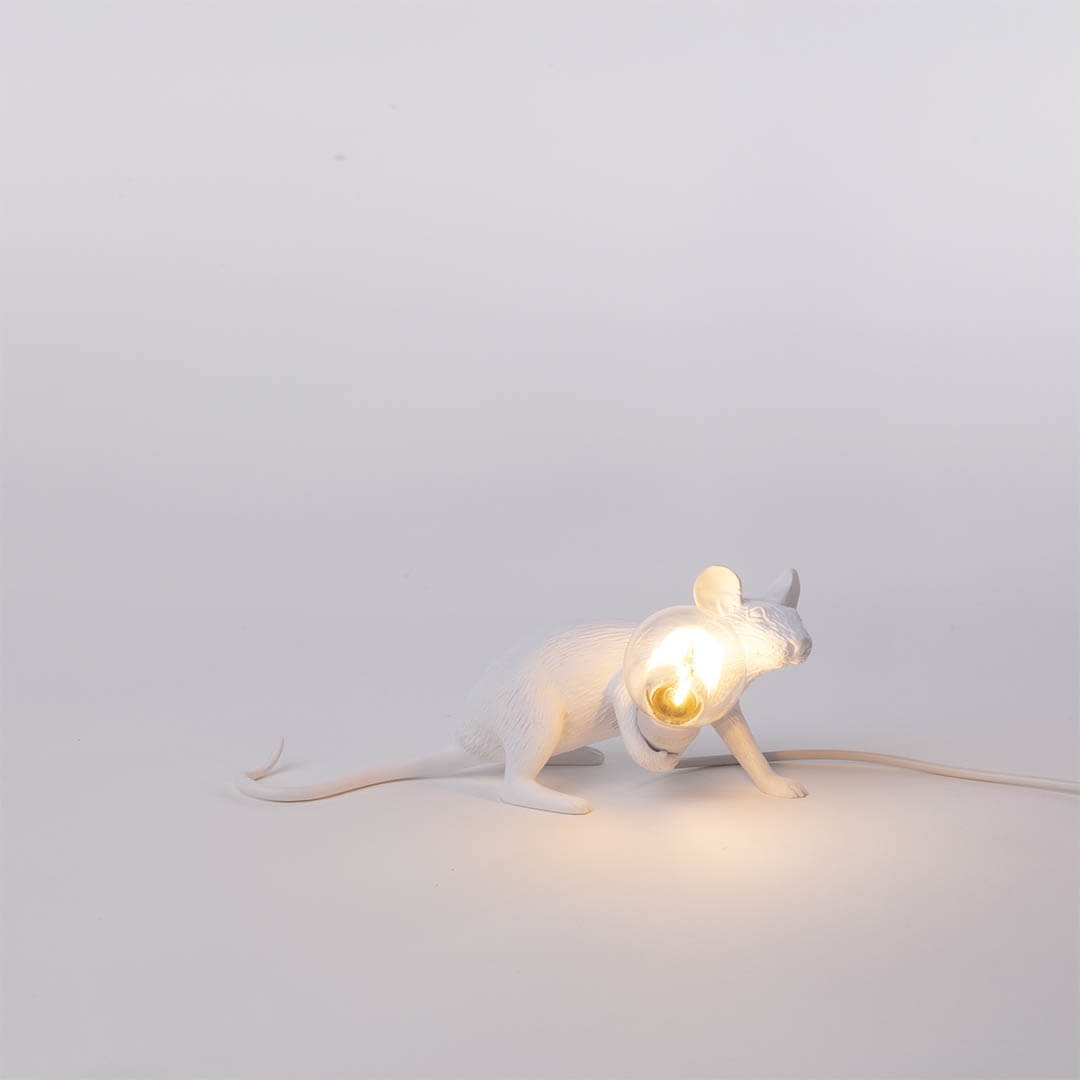 Mit dieser Tischlampe, die einer echten Maus verblüffend ähnlich sieht, greift der Designer Marcantonio Raimondi Malerba erneut auf sein Lieblingsthema zurück: die Verbindung zwischen Mensch und Natur. Diese hübsche, originelle Leuchte gibt es in verschiedenen Positionen (stehende, sitzende oder liegende Maus) und in diversen Farben (weiss und gold). Alle Varianten werden sicherlich ein verschmitztes, stimmungsvolles Licht in Ihre Dekoration bringen. Anstelle eines traditionellen Käses hält das kleine Nagetier eine LED-Glühbirne (inbegriffen) zwischen seinen Pfoten. Dies verleiht der Leuchte einen lustigen und schrägen Touch, der Gross und Klein gefallen wird. Die aus Kunstharz gefertigte Lampe ist sehr realistisch. Die Lampe wird an ein USB-Kabel angeschlossen, sodass Sie sie an verschiedene Geräte oder an jede herkömmliche Steckdose anschliessen können.