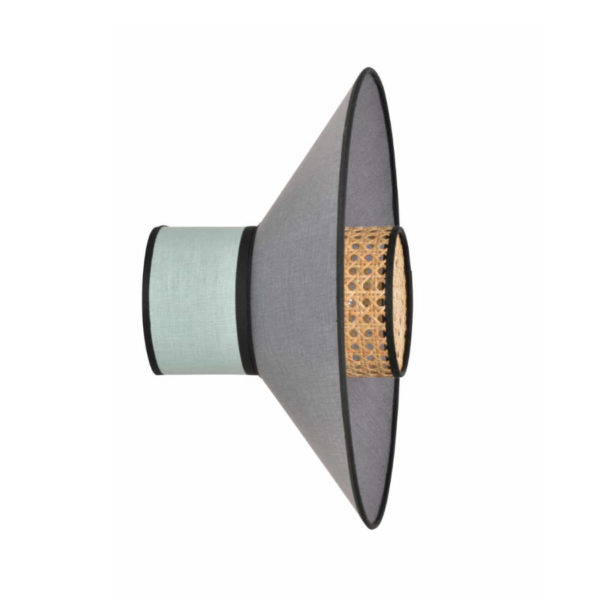 Applique forme conique, empilement de 3 abat-jour en lin lavé et cannage. Équipée d’une base ronde en métal peint adaptable DCL. Ampoule non comprise.